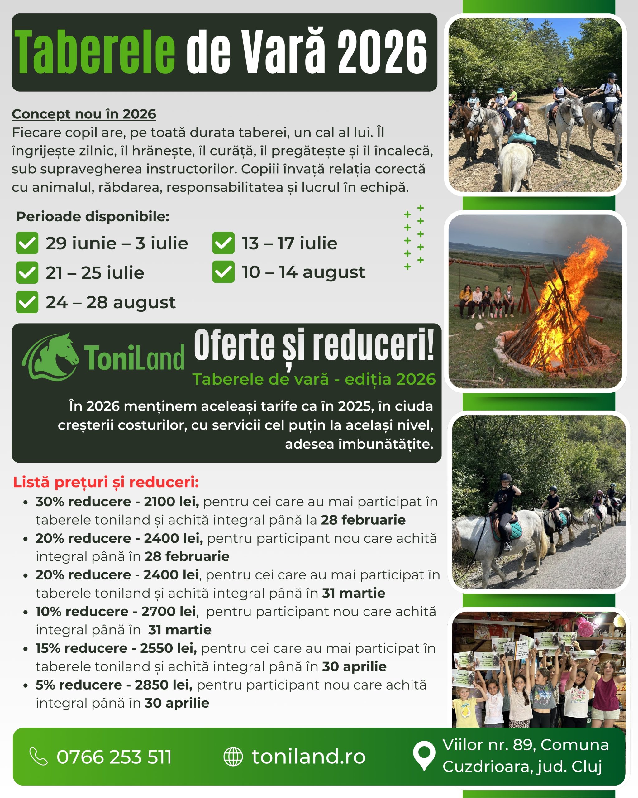 Ambele tipuri de tabere sunt organizate în cel mai modern centru de echitație din Transilvania, asigurându-ne că fiecare copil are parte de cele mai bune condiții și de o experiență de neuitat. La ToniLand, ne dedicăm pentru a oferi programe educative și distractive care să dezvolte pasiunea copiilor pentru echitație și natură.
